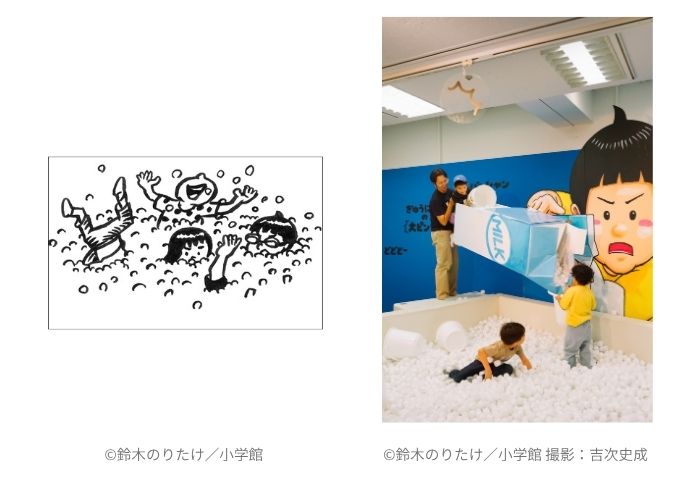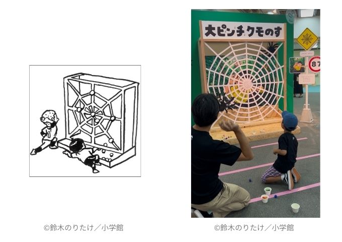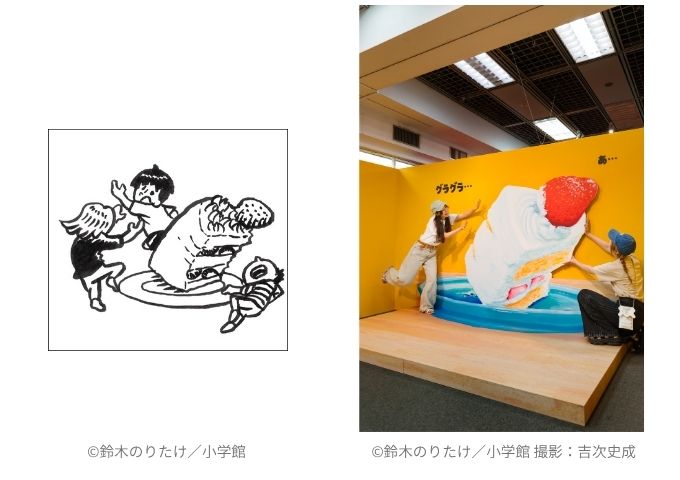 絵本作家の鈴⽊のりたけによる、⼦どもが⽣活の中で遭遇するさまざまなピンチを描いた、シリーズ累計250万部を突破したミリオンセラーの絵本『⼤ピンチずかん』(⼩学館)。本展は、鈴⽊のりたけ自らが考案し、制作した「ピンチ・エンターテインメント」で来場者は絵本の中を巡るように遊べます。全国巡回の⽴ち上がりとなった横浜会場で4万⼈超の動員を記録。会場には⼦どもと⼤⼈の笑顔があふれ、SNSでも話題沸騰となりました。さらにPLAY! MUSEUMでは限定で、デビュー作品の絵本原画や、『⼤ピンチずかん』のラフスケッチなどの特別展⽰と、絵本や展⽰から着想を得たコラボメニューが楽しめるカフェがプラスされ、鈴⽊のりたけ「⼤ピンチ展!プラス」としてお楽しみいただけます。