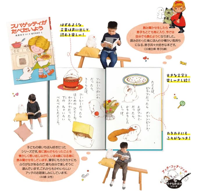 1979年に『スパゲッティがたべたいよう』でスタートした「アッチ・コッチ・ソッチの小さなおばけ」シリーズは、魅力的なキャラクターと自由な発想のストーリーで、子どもたちの大きな支持を集めました。親から子へと世代を超えて読み継がれています。子どもたちにひとり読みの楽しさを届けたいという思いを込めて、角野さんのライフワークとして毎年新刊が発表され、幼年童話のロングセラー・シリーズとしてファンを増やし続けています。