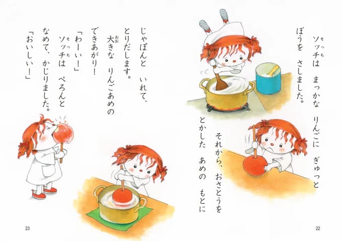 ソッチが作る丸ごとリンゴやきゅうりのキャンディー、黒雲のわたあめ、虹のキャンディーなど、ユニークなキャンディーが次々登場。がんばるソッチを応援したくなります。