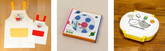 左:(キッズ&レディース)だるまさんと エプロン 親子セット レッド&イエロー(絵本ナビオリジナルグッズ)中央:きんぎょがにげた きんぎょのたおる タオルハンカチブルー 右:こぐまちゃん ふわっとランチボックス