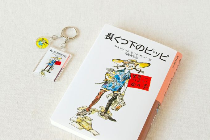 赤毛を三つ編みにし、だぶだぶのシャツを着て、色の違う長くつ下を履いた、すらりとしたピッピが描かれた表紙の絵柄がアクリルキーホルダーに!