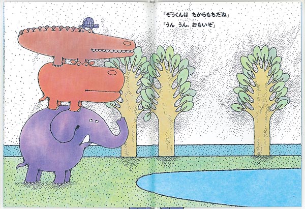 力持ちのぞうくんは、かばくんを背中にのせてさんぽです。すると今度はわにくんがやってきて……。