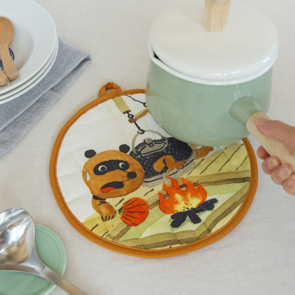 鍋敷きは、キッチンの中でも活躍の頻度が高いアイテム。キッチンのアイコンになるような、ぶんぶく茶釜のたぬきが描かれたキュートな鍋敷きです。キルティングにパイピングで縁取りされた丈夫なつくりになっているのも嬉しいですね。