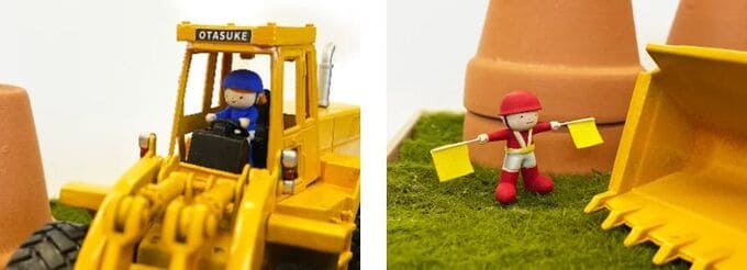 「どーもくん」や「こまねこ」などコマ撮りアニメーションスタジオのトップランナーであるドワーフスタジオが、『おたすけこびと』に登場するこびとたちや重機を立体化。こびとたちは原寸大サイズで、愛らしい表情のキャラクターデザインに仕上げられています。