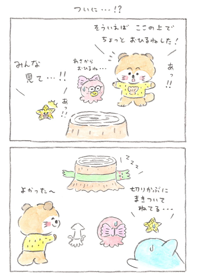 ついにぶーちゃんを発見! 切り株に巻き付いて寝るぶーちゃん、ぐっすりっぷりになんだか笑っちゃいます。