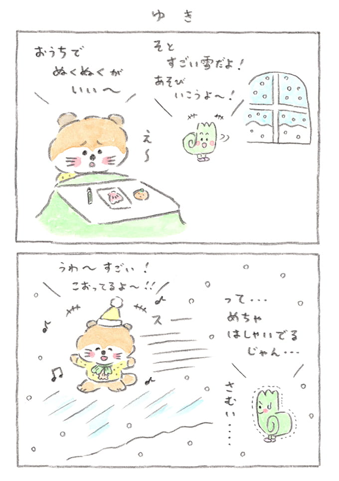 最初は乗り気じゃなかっただっこちゃんですが、楽しそうでよかった~! 一方で、雪遊びしたかったぶーちゃんはブルブル……。