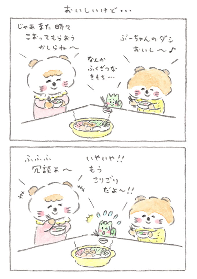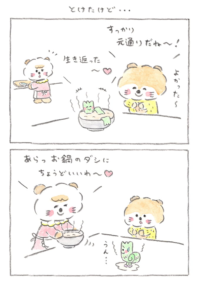 ぶーちゃん、温まって元に戻って一安心! しかしだっこちゃんママったら、お湯をダシに使っちゃうなんて……。だっこちゃんと同じおとぼけさを感じますね。